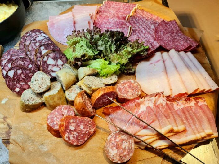 アウフシュニットと呼ばれる薄くスライスしたソーセージ類や、生ハムなどの肉加工品。