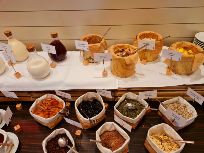 ホテルのビュッフェには様々な麦や種、ナッツ、ドライフルーツなどが並ぶコーナーがあり、自分好みに配合できます。