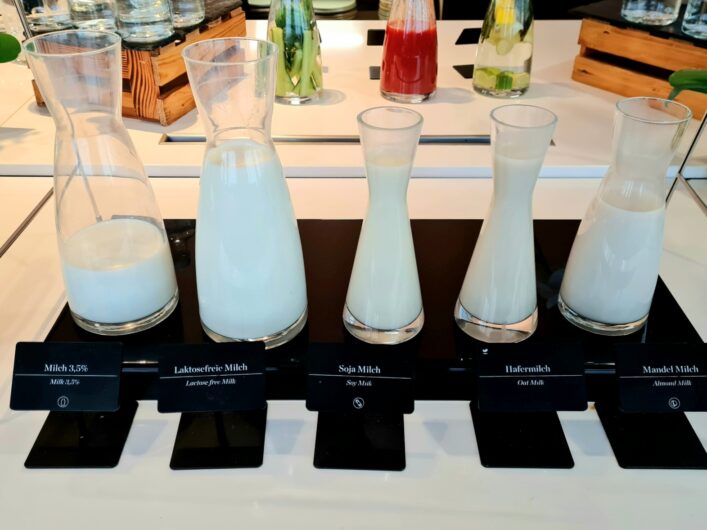 ビーガン人口の割合が高いドイツでは、オーツミルクや豆乳、ライスミルク、アーモンドミルクなど、牛乳に代わる植物性ミルクの種類が豊富で市場が拡大中。