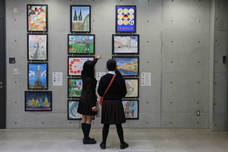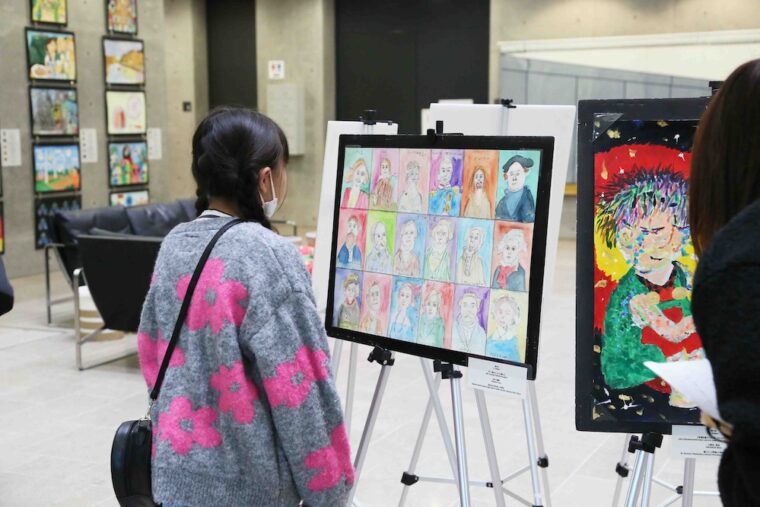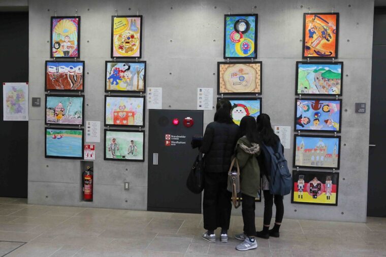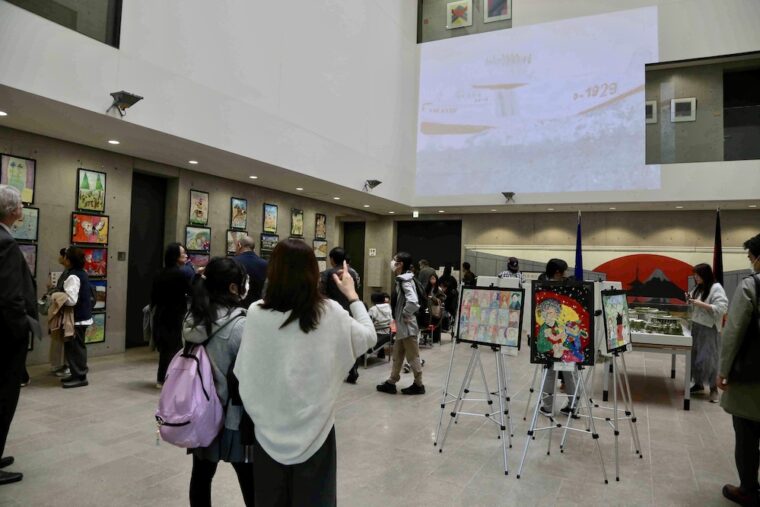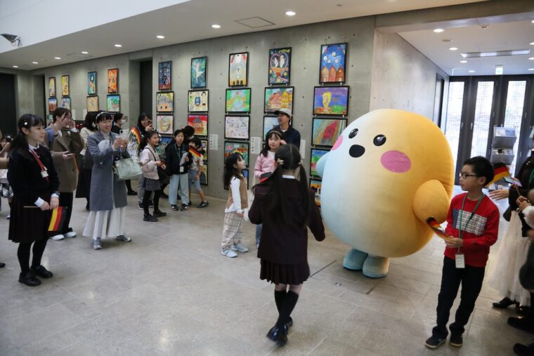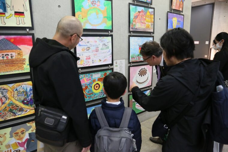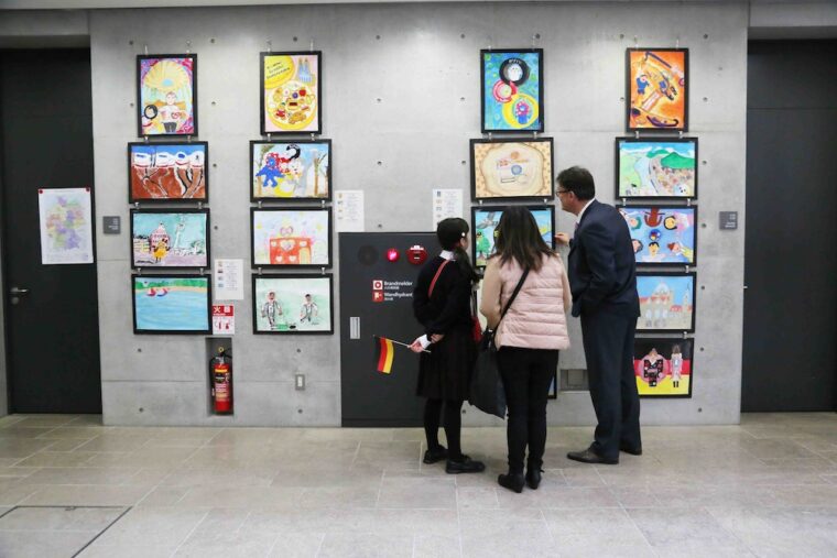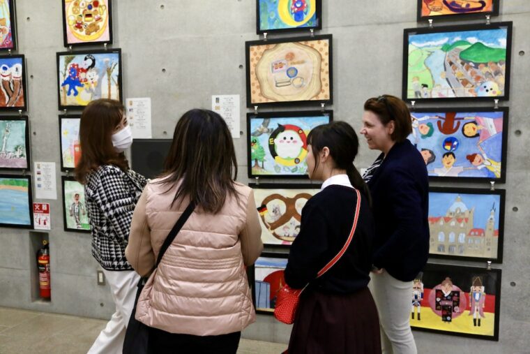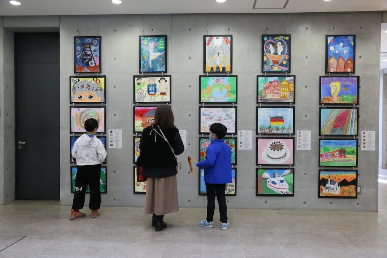 オープンデーの会場はドイツ大使館のアトリウム。作品を送ってくれた若きアーティストのみなさんとご家族、そしてコンテストの協力者のみなさんがたくさん観に来てくれたんだ。