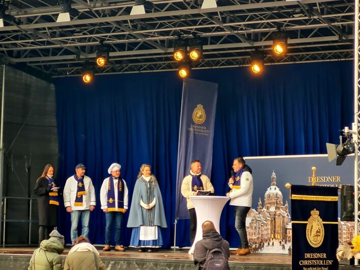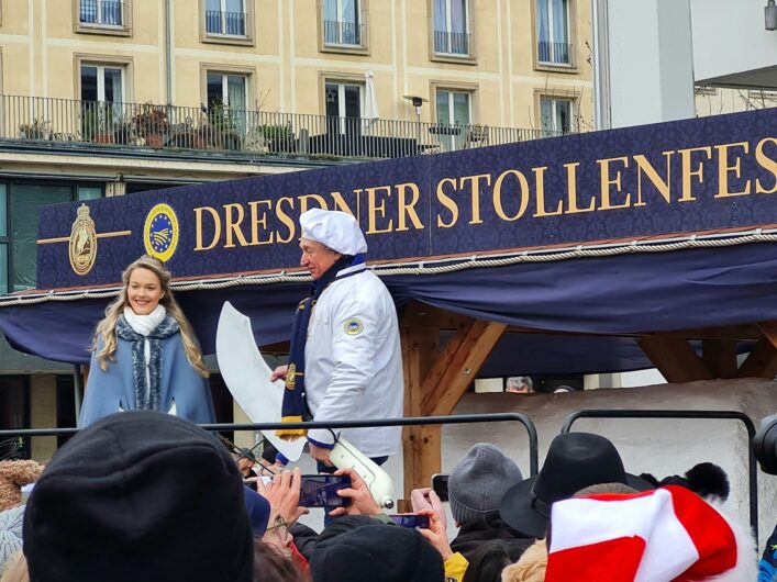 壇上にはドレスデンシュトレン保護協会の方やミスシュトレンが登場し、トークを繰り広げます。ミスシュトレンは、ドレスデンのシュトレンを愛し深い知識を持つパン・菓子職人や販売員などから毎年選ばれ、一年間アンバサダーとして活躍します。2025年のミスシュトレンに選ばれたのは、職人見習い中の17歳のJohanna Worm さん。