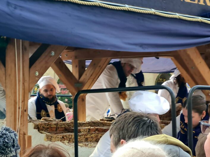 この巨大シュトレンは、ドレスデン中の職人さんたちが手分けして焼いた約500gずつのピースを組み立てて作られたもので、パレード終了後に巨大なナイフで切り分けて販売されます。今年は約3300個ものピースが使われたそうです。