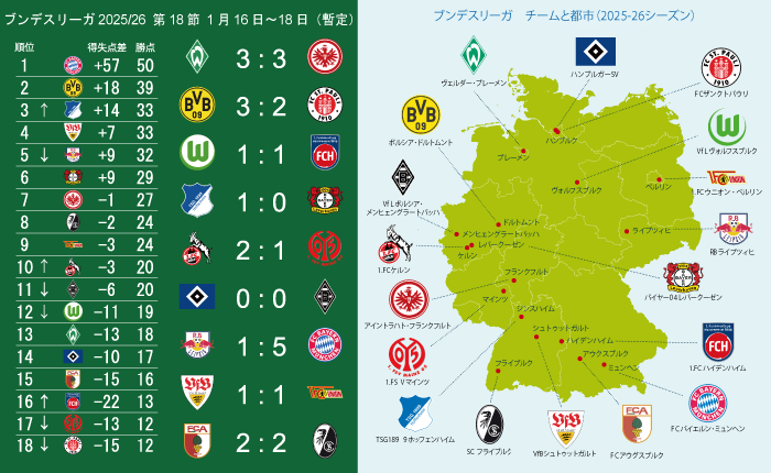 前半17節をみるとバイエルンが15勝2分けと無敗を保ち得失点差が53と断トツの強さ