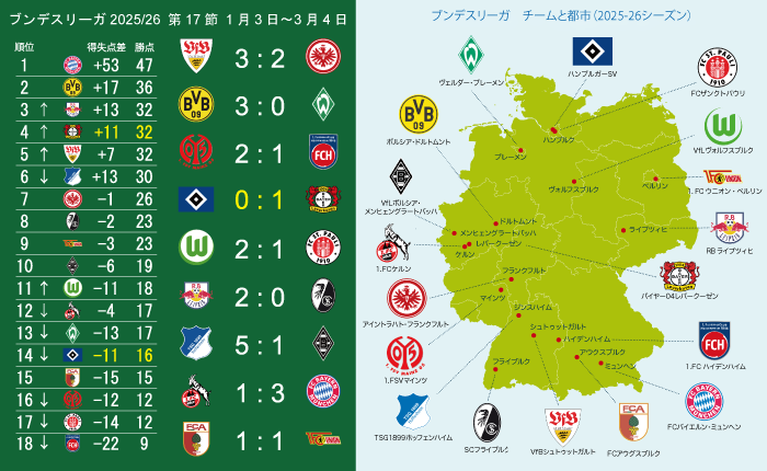 第24節の後に行われ日程的に前後するけど第17節のハンブルク対レヴァークーゼン戦はレヴァークーゼンが勝利。
