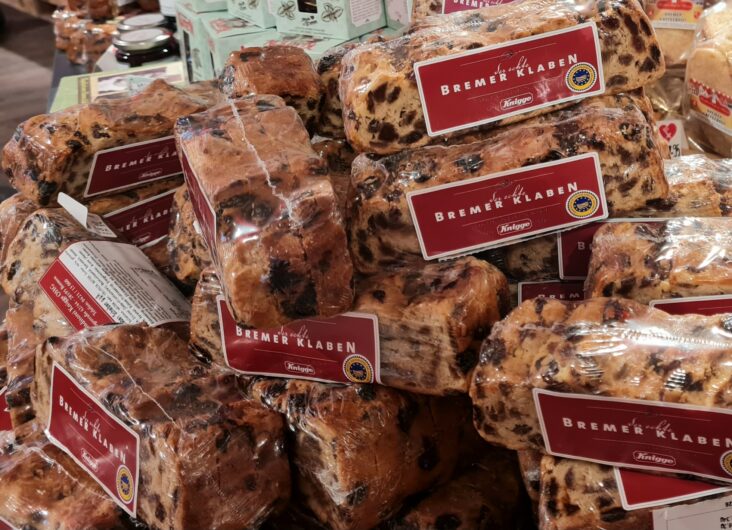 ブレーマー・クラベンは、ドライフルーツとバターをたっぷり使ったフルーツケーキ。材料も見た目もシュトレンに似ていますが、よりレーズンの密度が高く、しっとりしています。四角い型に入れて焼き上げられ、小さいサイズもあるので、お土産にもぴったりです。歴史は古く、初めて言及された文書は1593年のもの。2009年には欧州連合の「保護地理的表示(PGI)」に登録され、ブレーメンで生産されたものだけが本物の「ブレーマー・クラベン」を名乗ることができます。