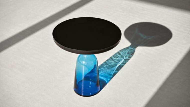 伝統的な手吹き製法によるガラスのベースに、重厚な金属の天板。「ベル・テーブル」は、現代のデザインシーンにおけるマスターピースとして高い評価を誇ります。