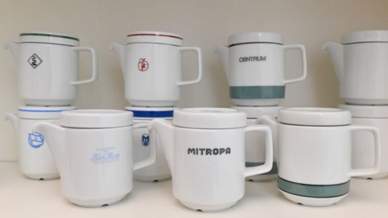 この食器はかつての東ドイツで、ミトローパ(MITROPA)社の寝台・食堂車をはじめ、ホテルや病院などあらゆる場所で愛用されていました。列車の激しい揺れや傾きの中でも蓋が外れないよう、緻密に計算された機能的な構造は、まさに合理性の極致。